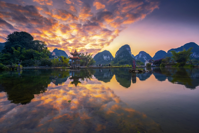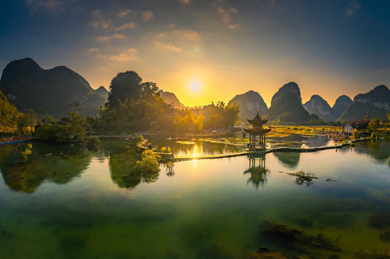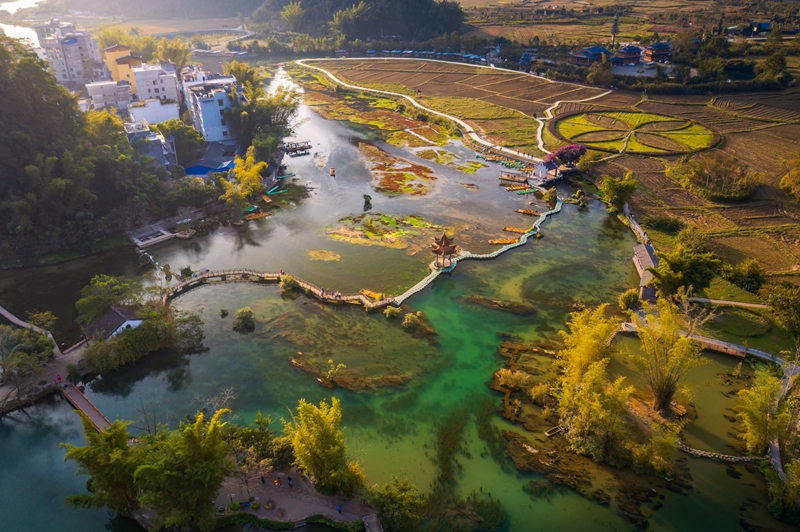 7、[明仕田园]—这是一个极具壮族风情的南国田园世界,翠竹绕岸、屋舍木桥、农夫荷锄、牧童戏水……犹如一幅世外桃源般的山水画,被人们称为“小桂林”。