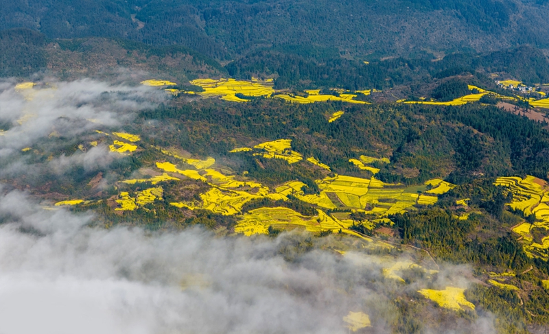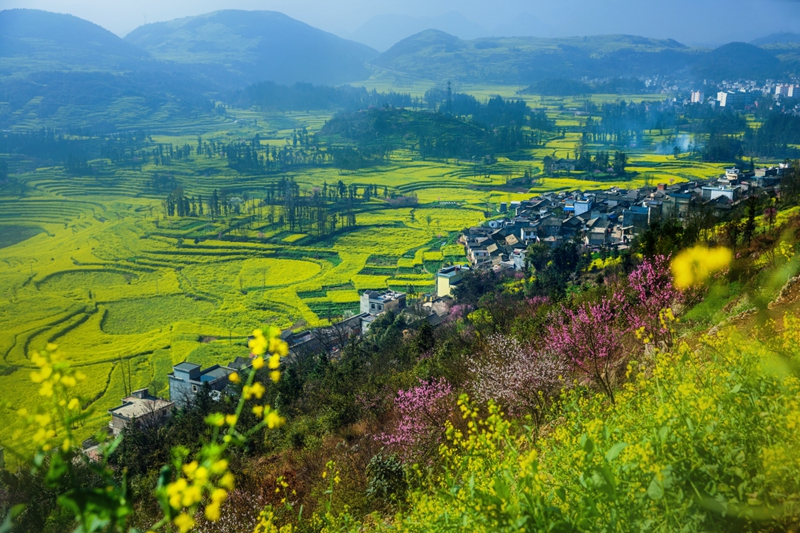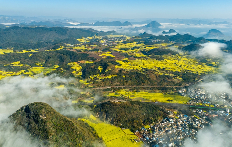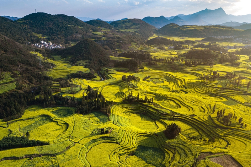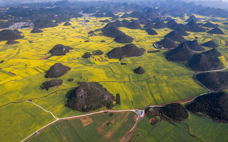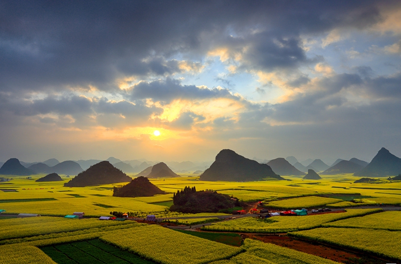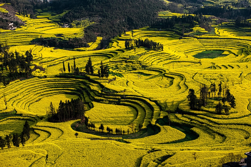 4、[罗平油菜花]—这里是油菜花的王国,一眼望去,成片的油菜花漫山遍野,如一个巨大的黄色地毯慢慢展开,是名副其实的“东方花园”。