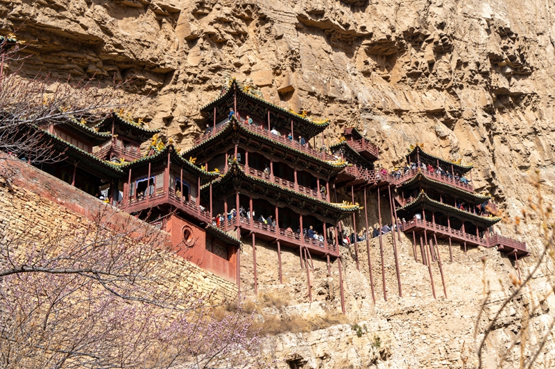 2、[悬空寺]—它是儒释道三教合一的寺庙建筑群,是中国现存较早、保存较为完好的高空木构摩崖建筑,为“恒山十八景中”的第一胜景。