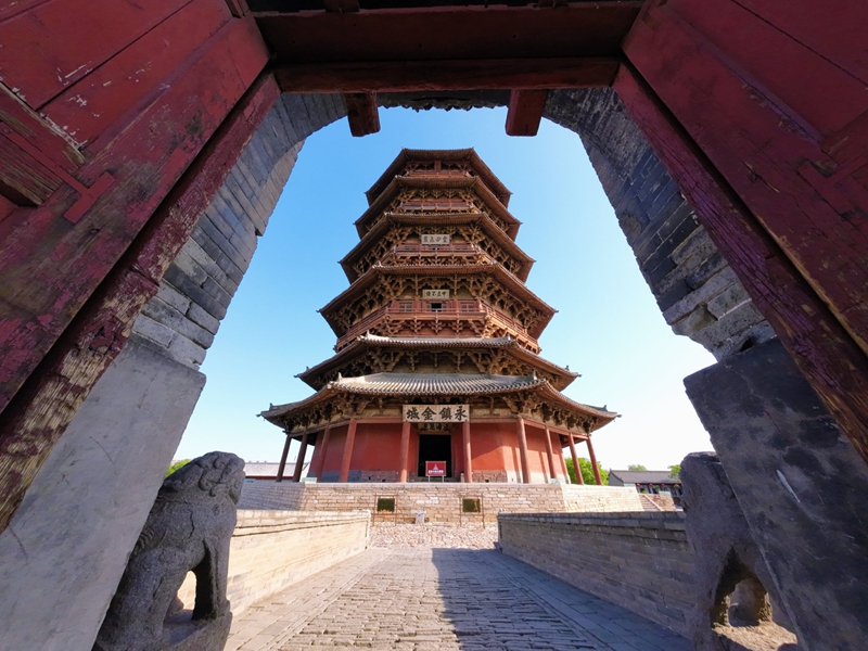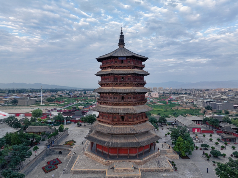 5、[应县木塔]—它是世界上现存最高大、最古老的纯木结构楼阁式建筑,与意大利比萨斜塔、巴黎埃菲尔铁塔并称“世界三大奇塔”。