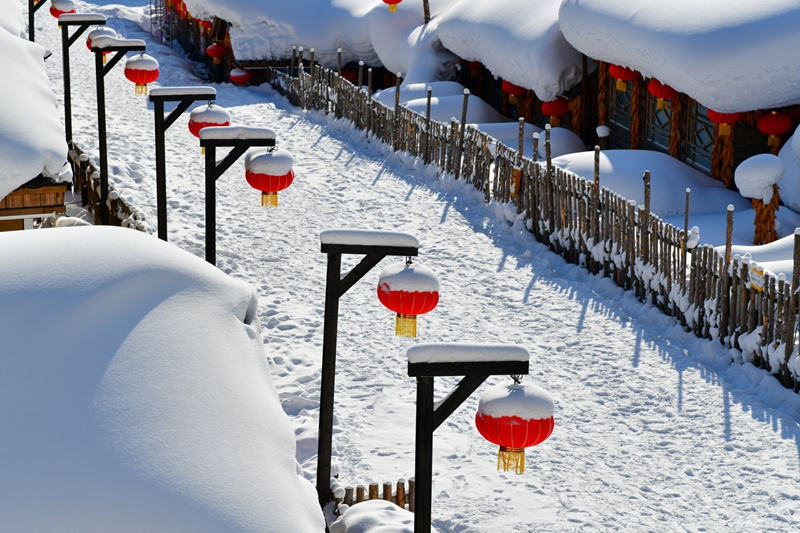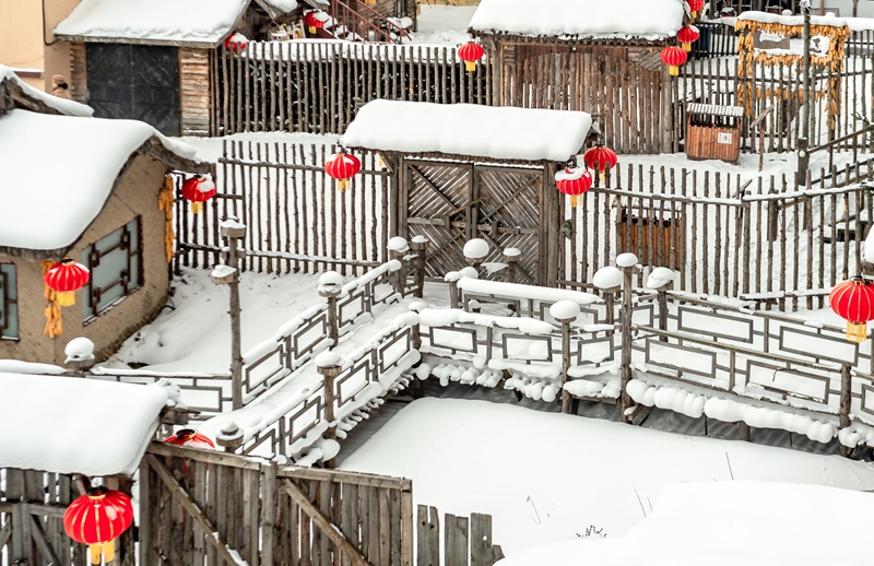 7、[松岭雪村]—它是大兴安岭林区南缘的一个自然村,住户不过百家,房屋顺山势而建,错落有致,冬季里大雪覆盖,高挂的大红灯笼,与周围山林相呼应,在山顶上眺望,仿佛是一幅精美绝伦的水墨丹青画卷。
