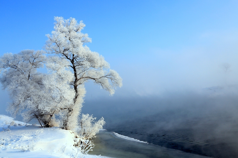 9、[雾凇岛]—它因雾凇多且美丽而得名,这里树形奇特,沿江的垂柳挂满了洁白晶莹的霜花,江风吹拂银丝闪烁,为我国四大奇观之一,素有“吉林雾凇天下奇”之美誉。
