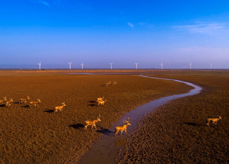 2、[野鹿荡]—这里有中国最大的野生麋鹿种群,超过7000头麋鹿在芦苇荡中自由生活;这里也是候鸟迁徙的重要驿站,每年十一月底到次年春天,有数以万计的候鸟从北方飞来越冬。