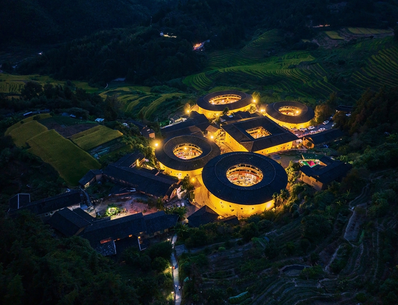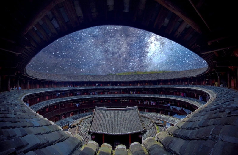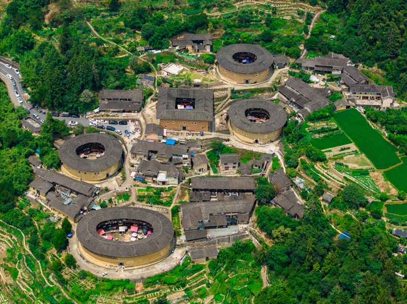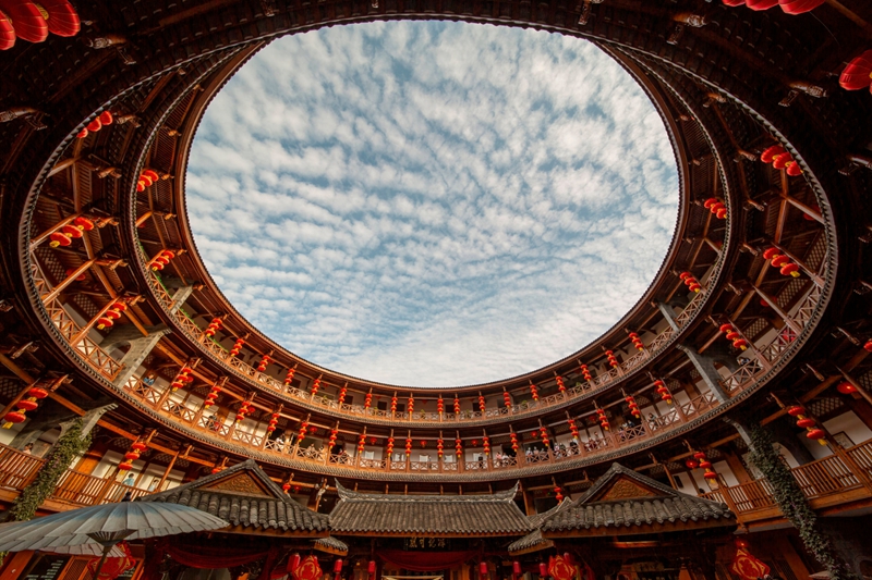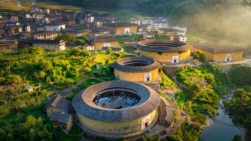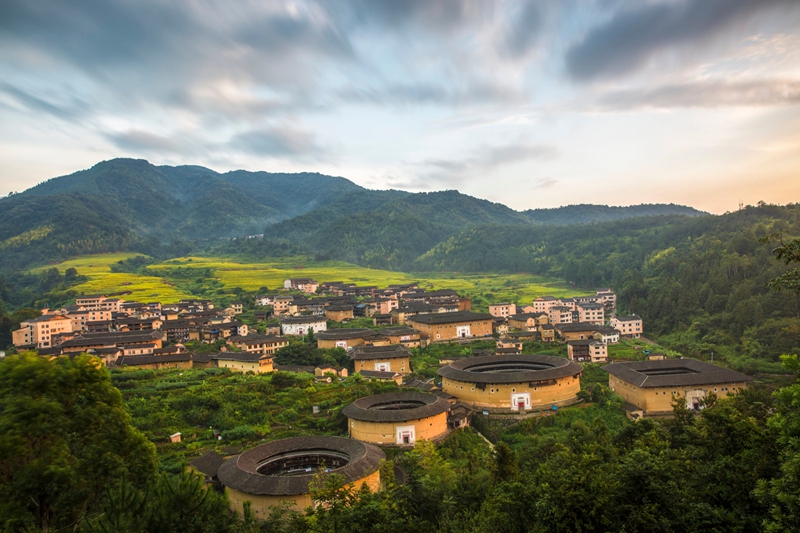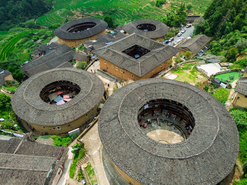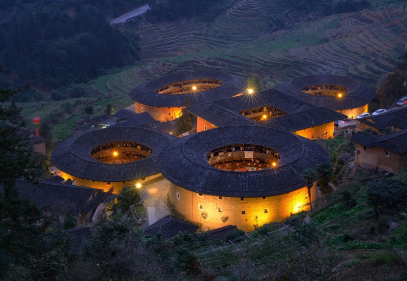 4、[福建土楼]—它是客家人发扬古老建筑技术创造的“世界建筑奇迹”,其建造遵循了“天人合一”的东方哲学理念,依山就势,风格古朴粗犷,形式优美奇特。著名的土楼群有南靖县田螺坑土楼群、云水谣土楼群等。
